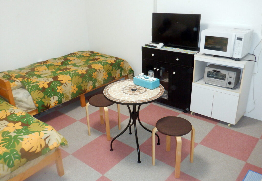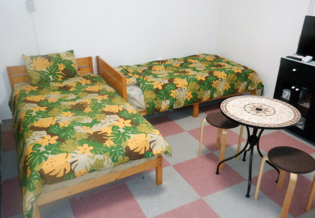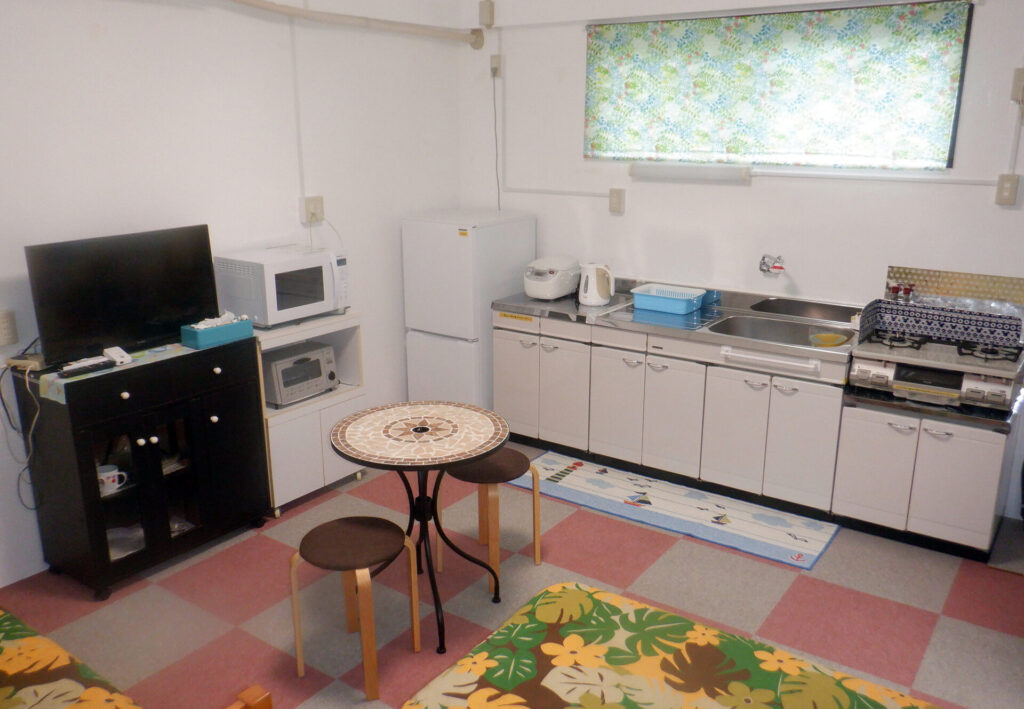 | 施設・設備 (1棟:ワンルーム) | シングルベッド2台キッチン・ガスコンロ・冷蔵庫・炊飯器・電子レンジ・トースタートイレ・ユニットバス・洗濯機(無料)エアコン・インターネットWifi完備(無料) |