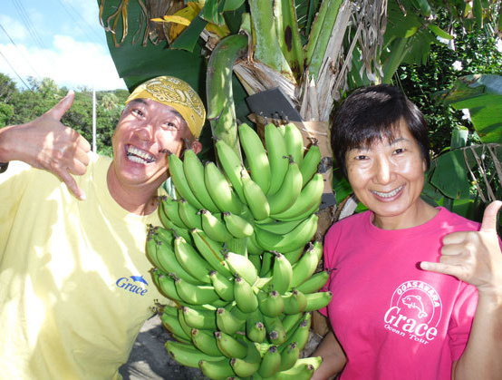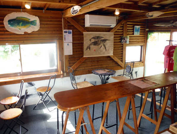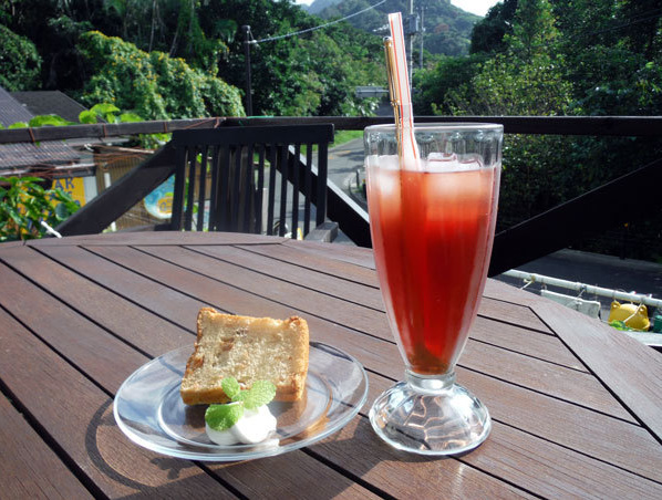 扇浦にほど近い場所に、ログハウス風の外観をしたグレース直営ショップ「島のお茶やさん」はあります。にぎやかな街の中心部から少し離れていますが、その分のんびり静かに島時間を楽しむことができます。ショップでは、自家栽培のフルーツや島の食材を使用したシフォンケーキとお飲み物を真心込めてお出ししています。テラス席もご用意してますので、心地よい風に吹かれながら、おくつろぎいただくこともできます。小港海岸やコペペ海岸からも近いですので、お昼時や街に戻る前に一息つくのに絶好のロケーションです。父島にお越しの際には、是非お立ち寄り下さい。